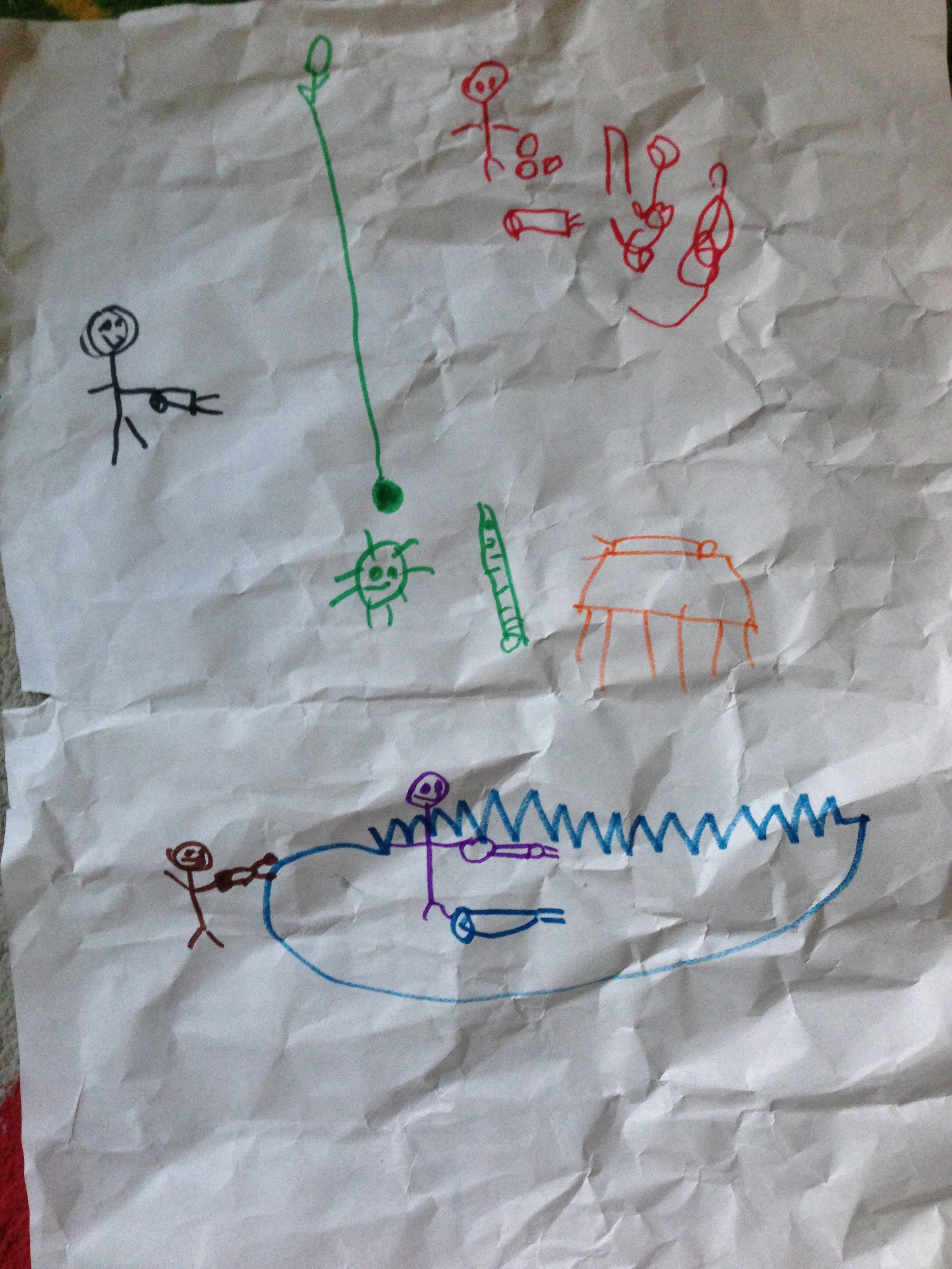 This is the way Sylvie decoded her drawing for me: First you catch the fish with a long fishing poll among other fish. (green drawing on the plan). When you have the fish, just take out its intestines and stuff it with cotton balls (black and red pictures on the plan). You have to leave it to dry on a table (the orange) and then you can take it with you and go and play with it in the water – last picture on the plan.