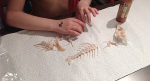 After some research on YouTube how a real taxidermy of a fish is done – she is with mixed feelings about the process and I thought to go to the grocery store and buy a whole raw fish. While I’m reviewing recipes for the Sunday lunch, Sylvie is impatient to wash and play with the fish. Washing turns out not to be too much fun but then Sylvie came out with another idea – to reconstruct the bones of the fish and keep its skeleton! We baked the red snapper in the oven and she wanted to collect all bones from the meal. Big and small, we found ourselves picking carefully the bones of the fish and mainly the pieces from the spine bone, the tail and the head. I had to wash them so the glue actually works. Sylvie was very determined to have them all, as she wanted to put them together and have the skeleton reconstructed. And she began trying to solve the puzzle-