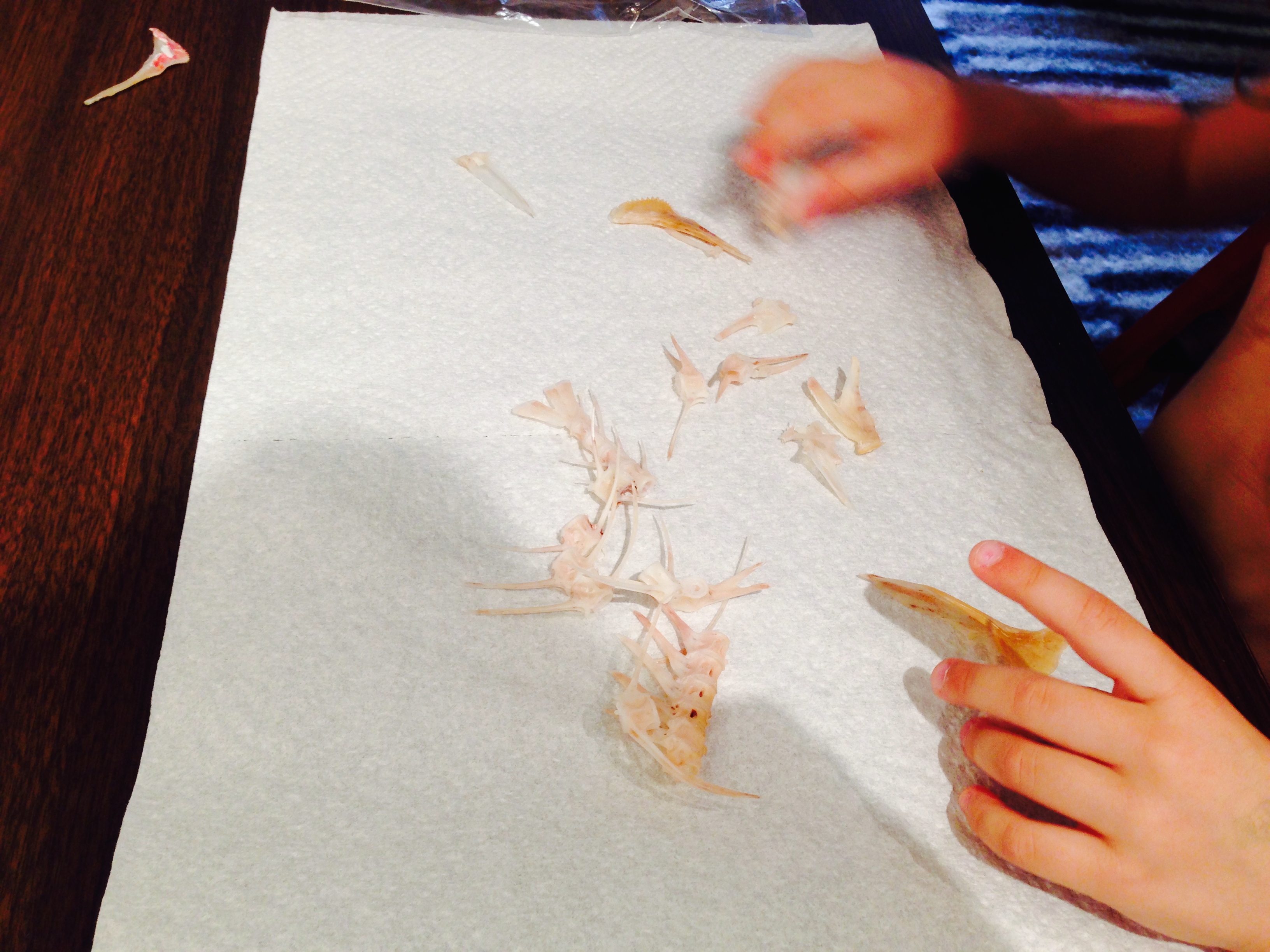 This red snapper was literaly used till the last bone- a project for couple of days, subject of enthusiastic talk and learning and it was a delicious meal. Sylvie brought the assembled spine bone to her pre-school class to share. It was an interesting scene for me to watch- she was carrying around kind of smelly, sharp fish bone, excitedly explaining what is this, as this is the coolest thing on Earth. Then she took the rest of the bones out of a zip log bag as a treasure and many of her friends, especially boys gathered around her and her bones. How excited and proud she was- While looking at her I was only wishing she stays always so curious and imaginative about the ways she explores the world around her- her way.