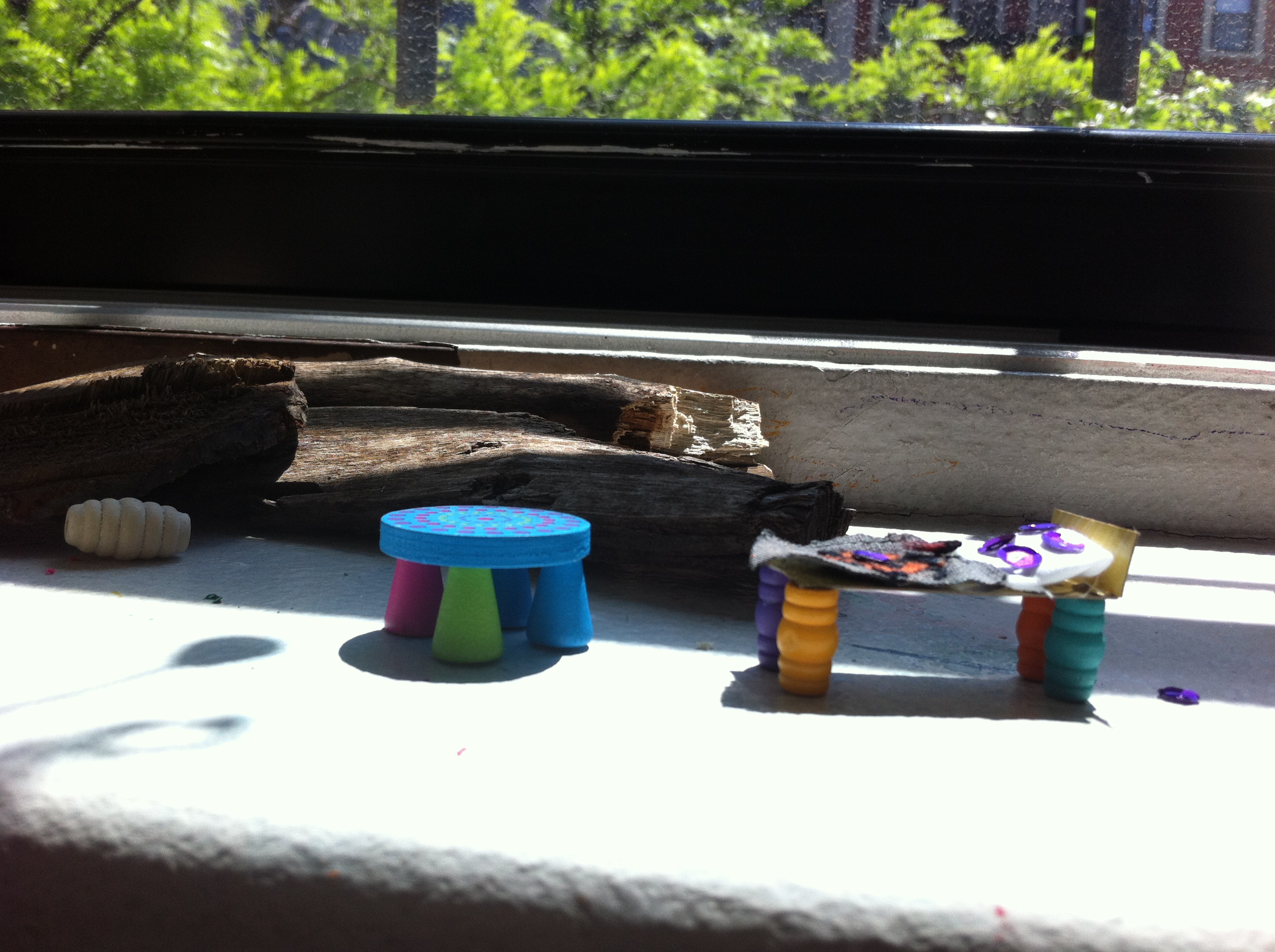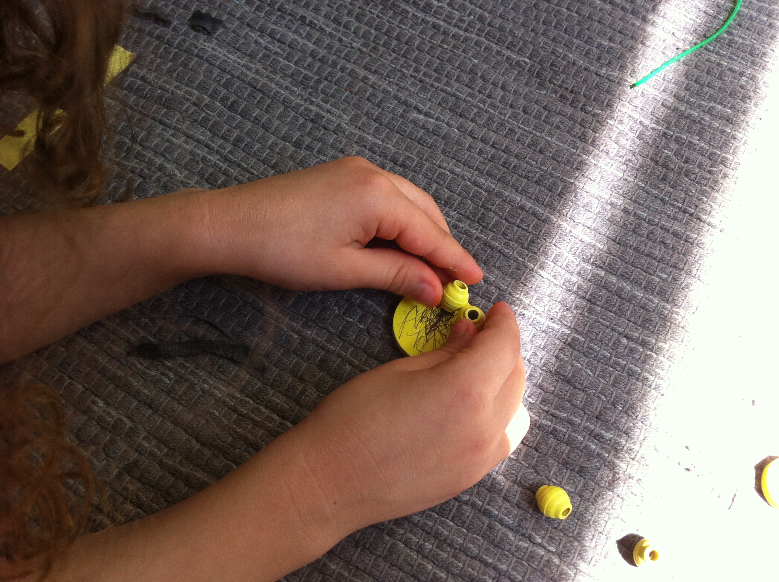 First “he needs a bed”. And she made one out of wooden beads, cardboard, cotton fabric and some cotton for stuffing. Mommy had to help with sewing the pillow only. ( I didn’t want technicalities to stop her creative flow, so I helped with anything she needed me to)