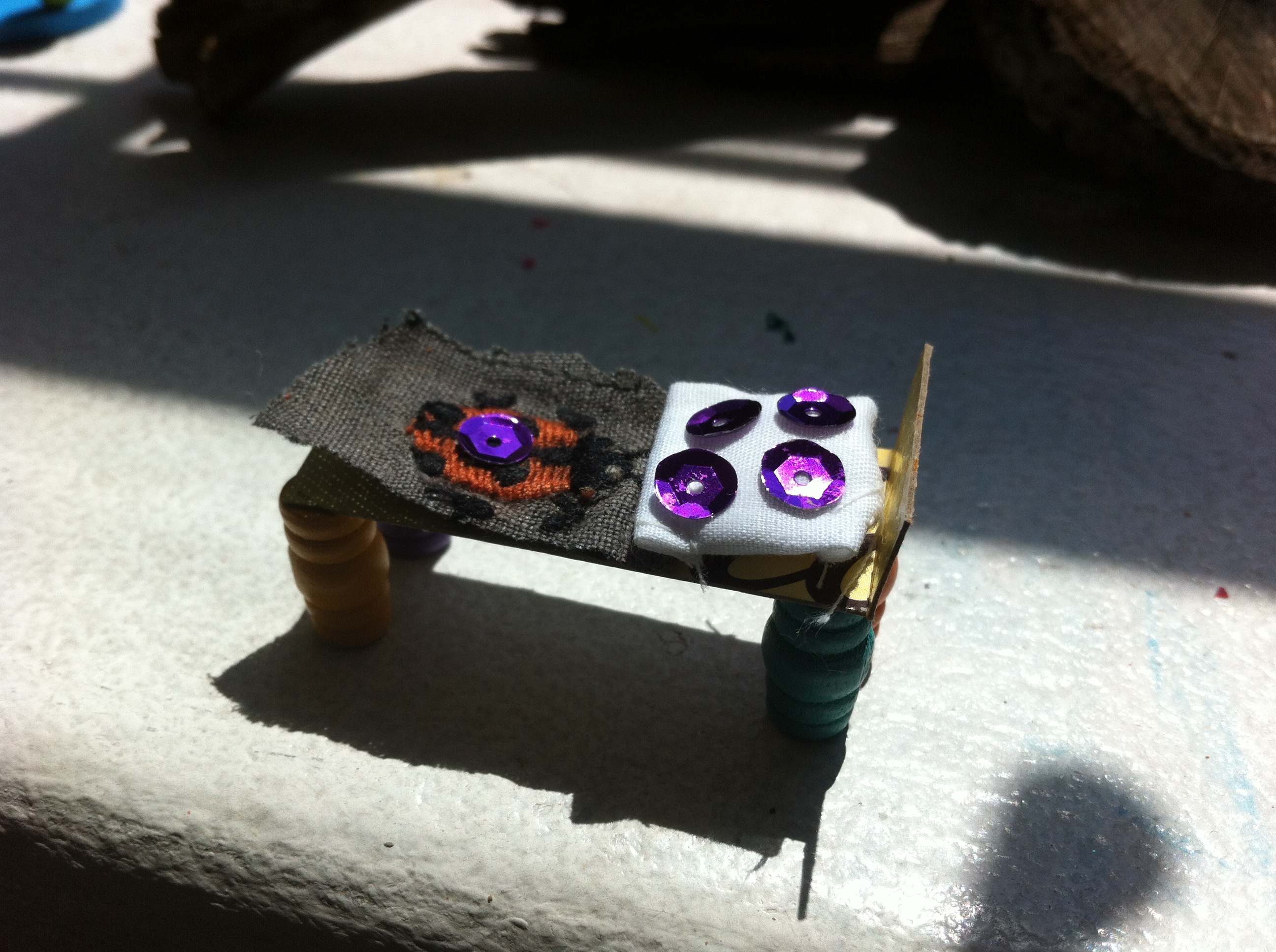 There is a Lady bug on Ferdy’s blanket, because he loves Laura – the Lady bug, explains Sylvie. The pillow is stuffed with cotton and Sylvie made it pretty with sequins. She glued a frame on the bed so his pillow doesn’t fall down. Then Ferdy would need a table, even two tables-