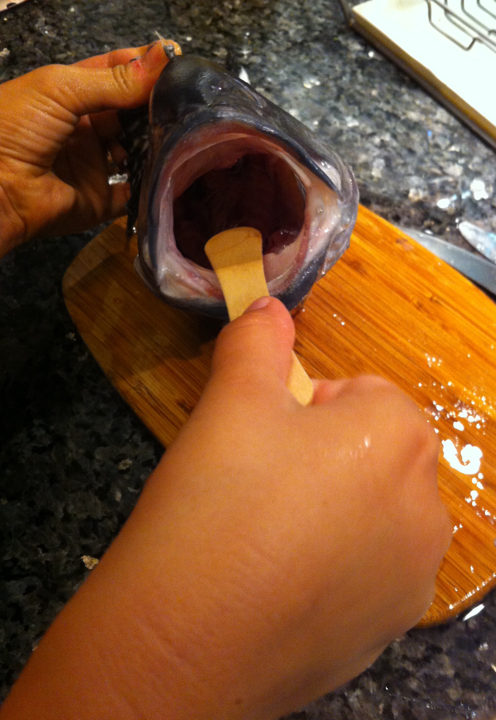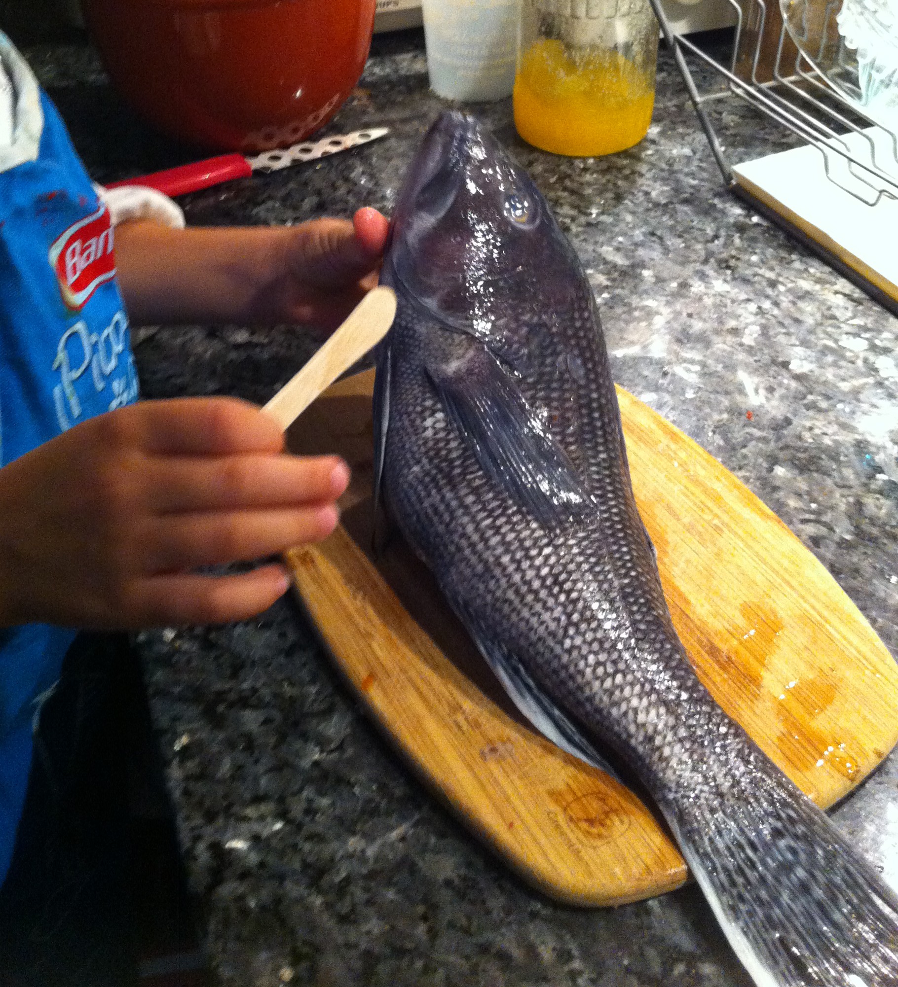 We brought home the fish. My father thought me how to clean a fish (who would think that this insignificant practical knowledge will provoke a surprise in 2015 urban environment. What a world!) Examining the fins, teeth, tail and then the intestines, looking for the bubble part filled with air inside its stomach was interesting, but Sylvie took part mainly in the first part -the outside exploration. Then she washed her hands and only watched what’s inside.