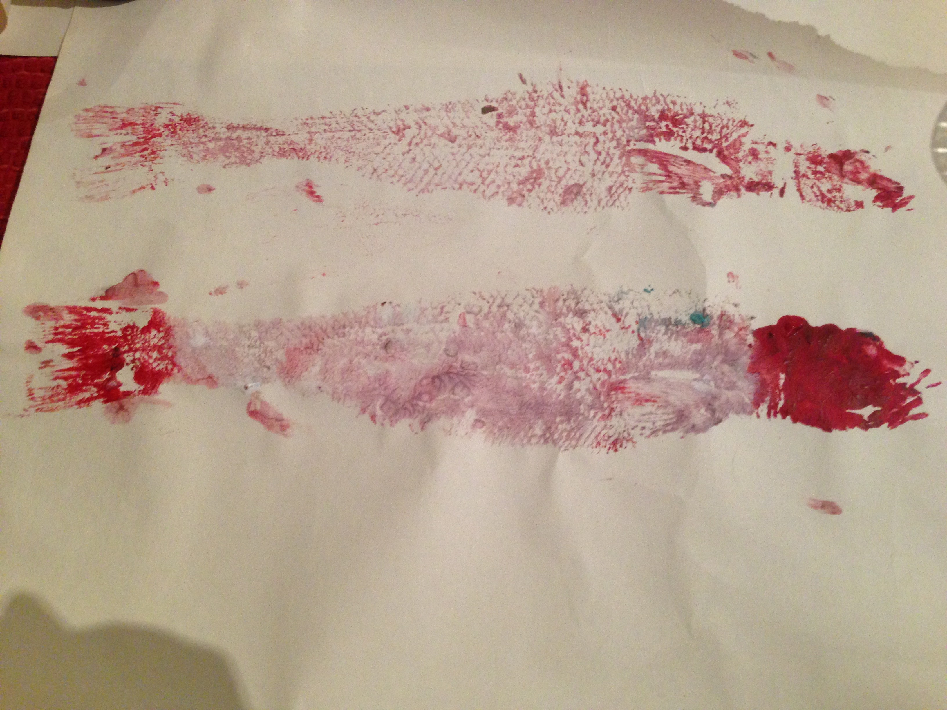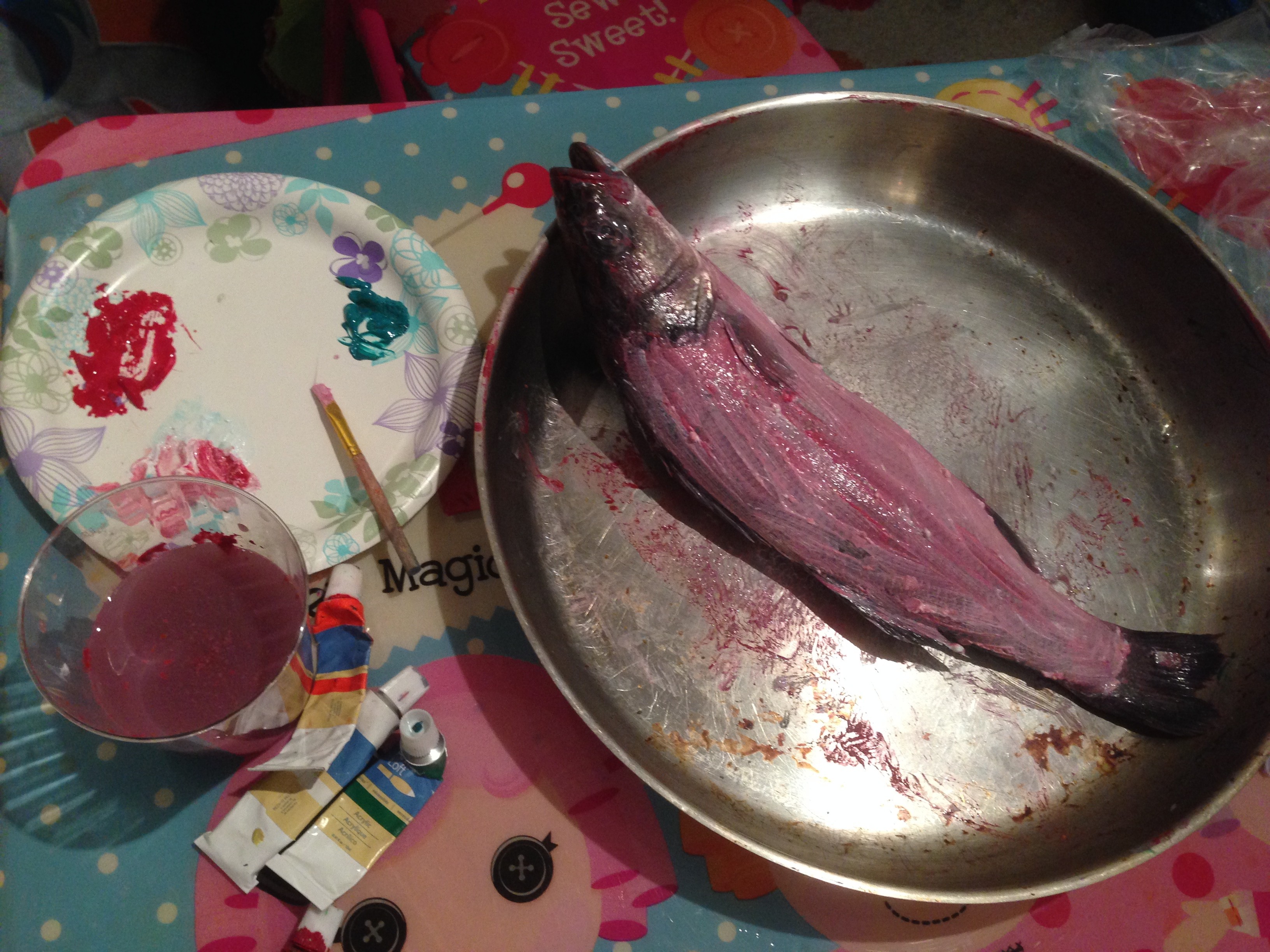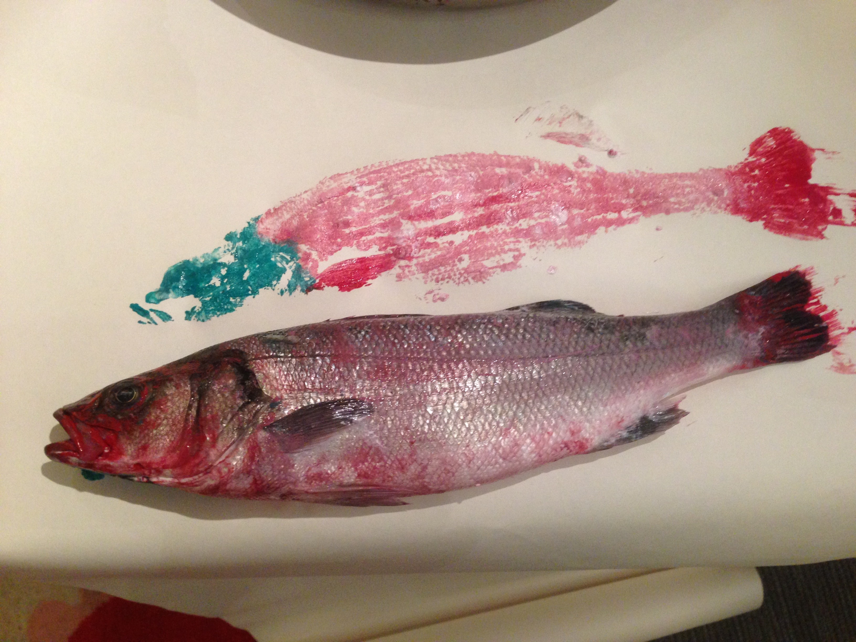 Have you ever made a print of a raw fish? Raw fish is a funny material to work with – it is wet, smooth, smells of ocean, has fins and when you have it in your hands you can imagine you are underwater talking to it . How about if you paint it and make a print on a piece of paper? All sounds great, especially if you are a 6-year-old and have been into fish for the last two years of your life. Take a whole fish, one of those cool to wash but never to eat and get your paint ready. Color the fish and slap it on the paper… The result is different every time –