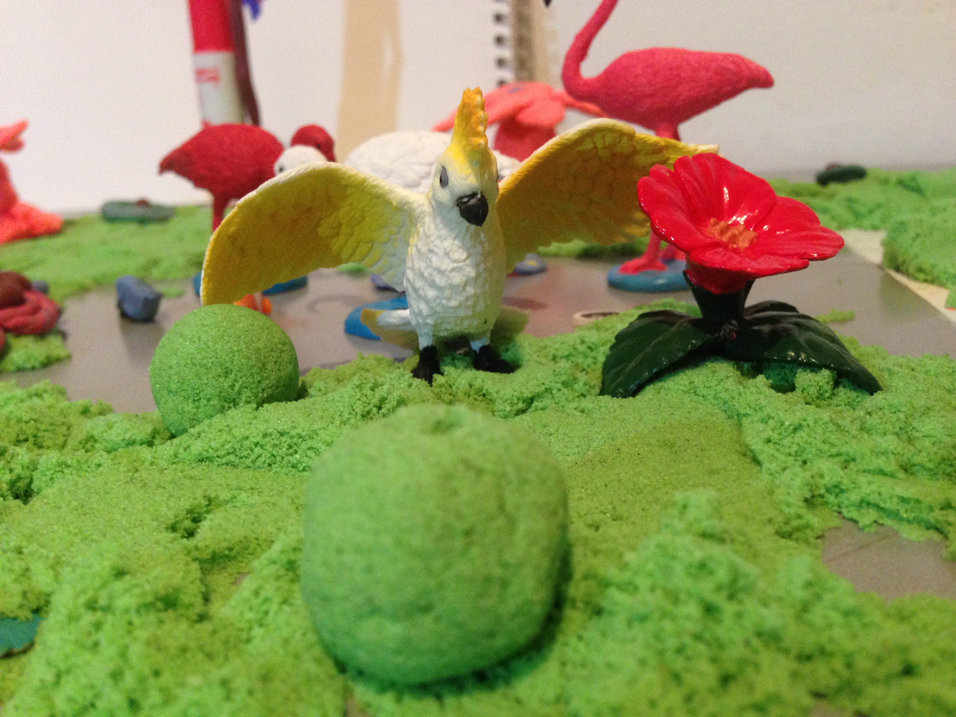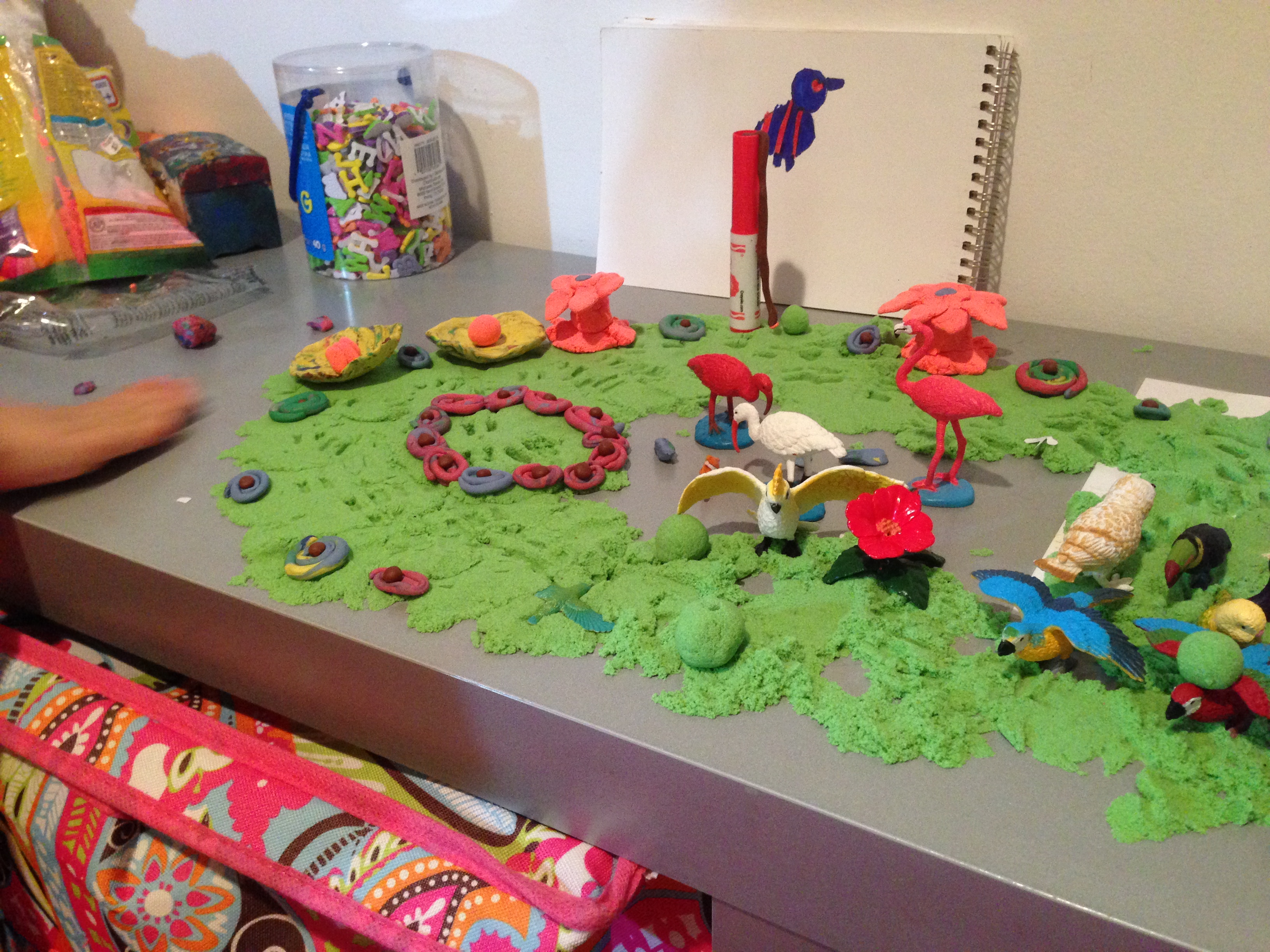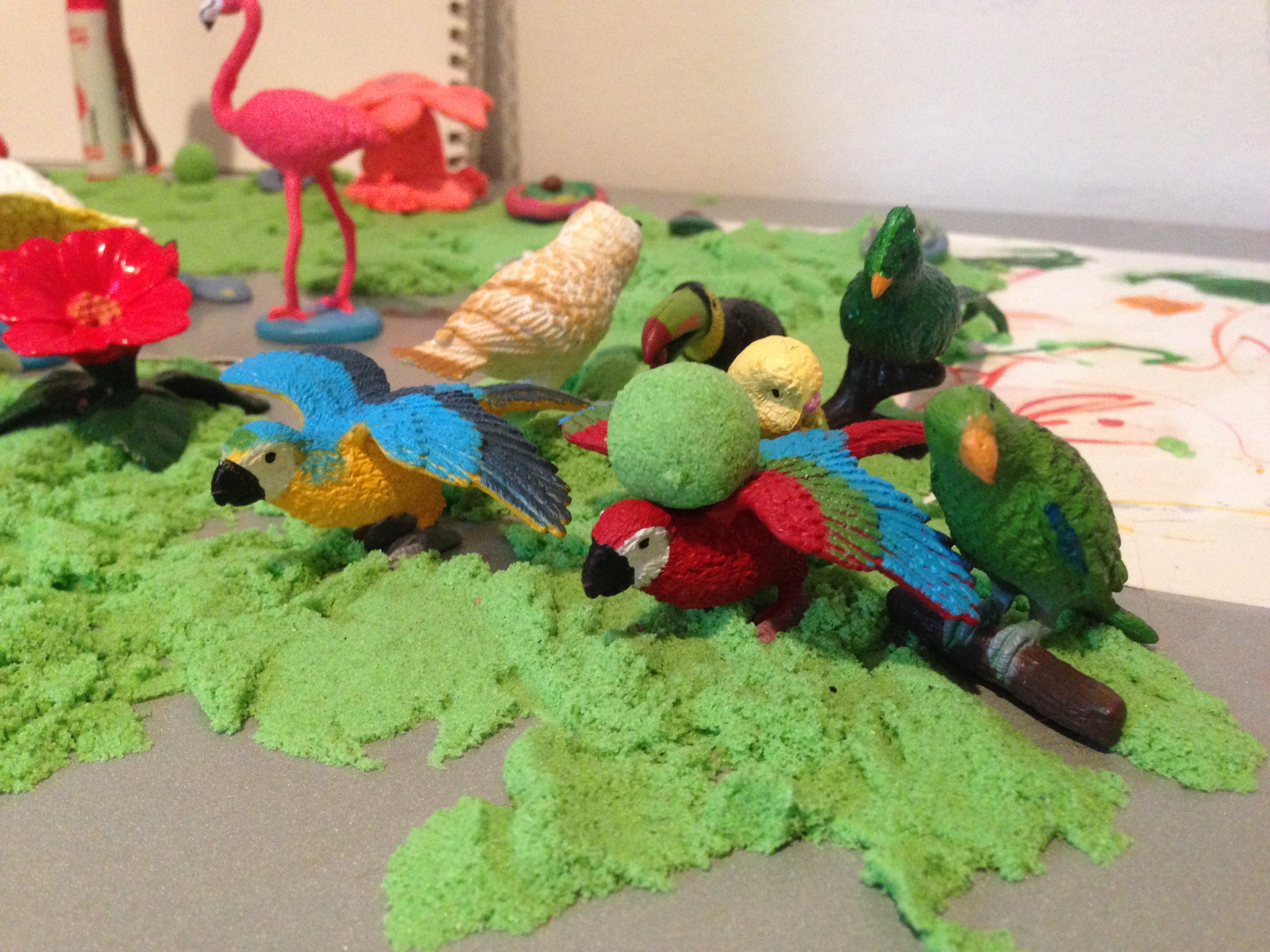 Sylvie created this island so all different kind of birds can nest, feed and enjoy. There is a pond where fish swim and flamingos and ibises slowly splash their long feet. There are big strange flowers for the hummingbirds and nesting spots where birds leave their eggs with no worries that someone would come and eat them. Some cacadou and parrots are making sand balls to carry around. Some of these balls are fruits. Sylvie made a TV for the birds to watch when they like- the notepad with a bird drawn on the paper. “So now let’s play” she says and we start pretending and figuring out stories and adventures on this island. A lot can happen on such a tropical island:)