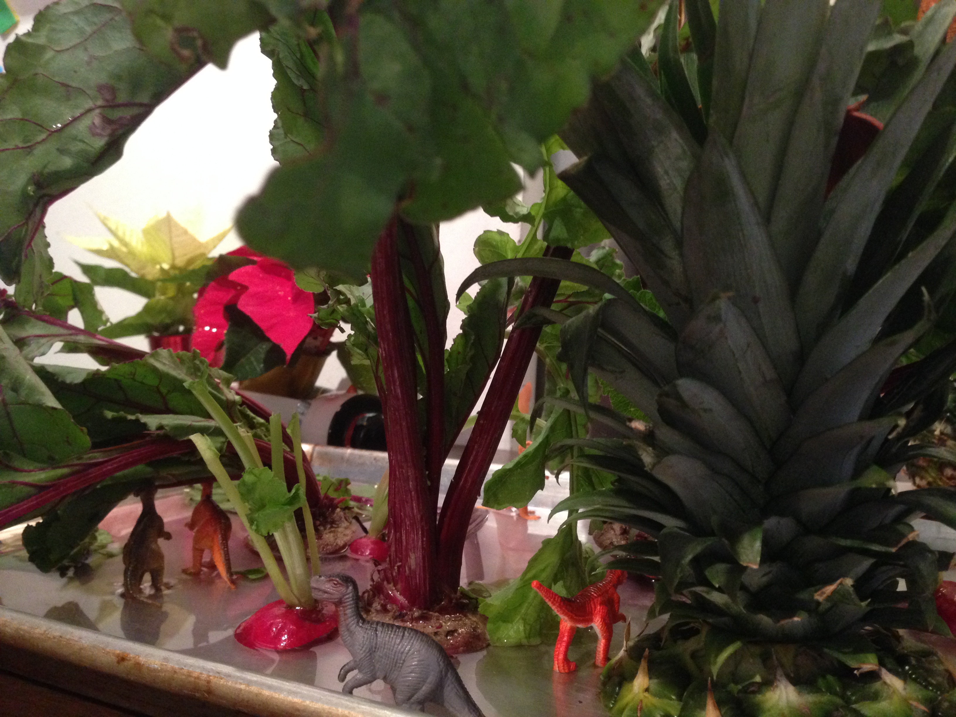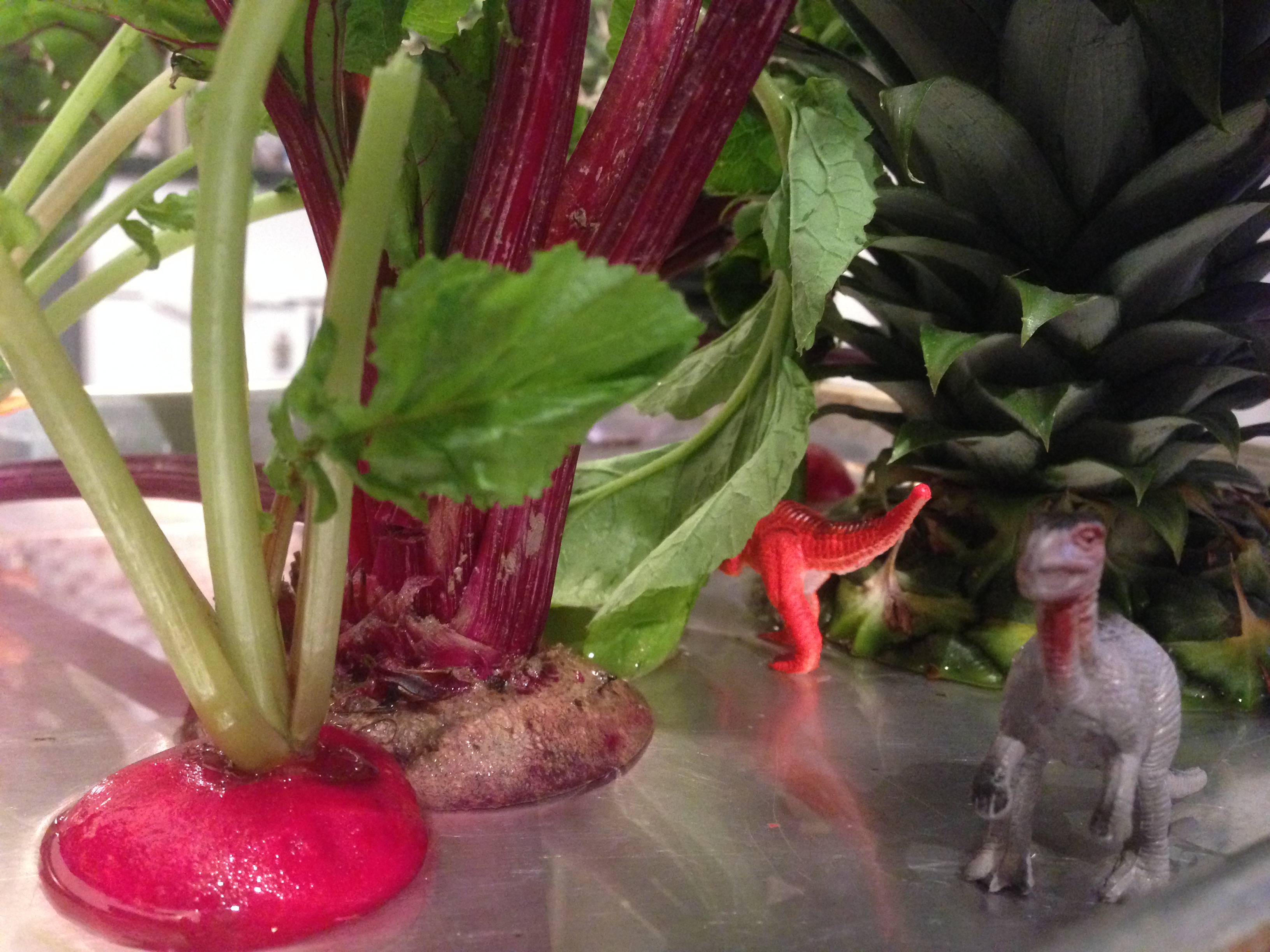 All kinds of stories could happen with dinosaurs among these thick trunks of tasty, freshly cut in our kitchen trees. This is a live exotic forest, made out of radish, pineapple, red beats’ stalks and leaves. This place is perfect for vegi-eaters. The lavish vegetation and tall leafy trees, like in the Jurassic period are a great playground for dinosaurs and their endless adventures. We cut the pineapple and the vegetables together (ah, the flavors and freshness are in the air) and put them on a flat surface with some water- the messier, the better, anyway. Let the play begin!